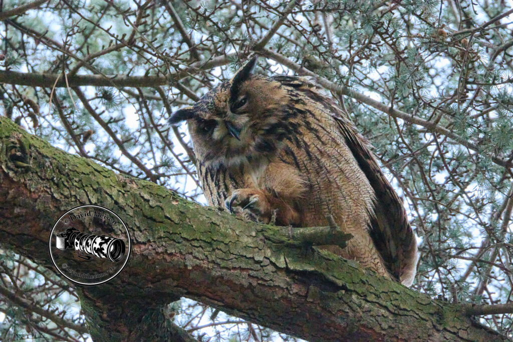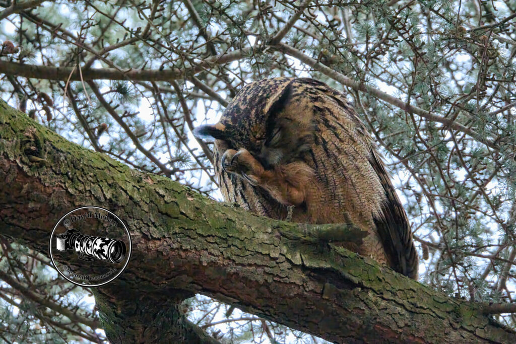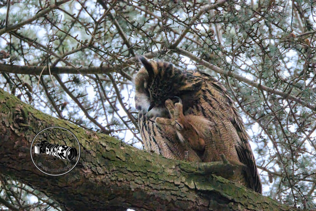 Dieser eine Uhu, den du hier auf dem Foto siehst, sitzt allerdings mitten in einer hochfrequentierten Parkanlage unweit des Kölner Zentrums. Im Januar letzten Jahres hielt sich wochenlang beharrlich das Gerücht, dass sich dort immer mal wieder ein Uhu aufhalten soll. Ich habe nicht daran geglaubt und ihn bei allen, von der Neugierde getriebenen, Besuchen auch nirgends finden können. Das Gerücht habe ich mir mit der Verwechslungsgefahr zur Waldohreule erklärt. Die ist zwar viel kleiner, hat aber eben auch die hübschen Federohren. Allerdings traf ich dann auf einen anderen Menschen mit derselben Neugier, der mir tatsächlich ein Handyfoto zeigen konnte. „Gibt’s ja nicht, das war wirklich ein Uhu“. Und kurz bevor der Januar zu Ende ging, erreichte mich während des Arbeitstages die Nachricht, dass er wieder mitten im Park sitzt. Einige Stunden, viele Kilometer im Auto und einen vollbepackten Sprint aus dem innerstädtischen Stau quer durch einen anderen Park später stand ich dann tatsächlich vor diesem riesigen Tier. Gerade noch bevor es an dem ohnehin schon düsteren und grauen Tag völlig dunkel wurde. Wenn man in so einer Situation noch fotografieren möchte, braucht es eine ruhige Hand. Die Belichtungszeit in diesem Setting muss sehr lang sein und die Gefahr, alles zu verwackeln ist groß. In Verbindung mit dem Tempolauf zuvor, der Aufregung und dem Adrenalin keine leichte Aufgabe. Mehr als 1000 Auslösungen später waren aber dann doch einige dabei, bei denen ich die Kamera ohne Stativ auch für eine Achtelsekunde ausreichend stillhalten konnte und der Uhu war im Kasten. Eine schöne Erinnerung an ein tolles Erlebnis. Warum der Vogel zeitweise immer mal wieder diesen Ort aufgesucht hat, bleibt sein Geheimnis. Nahrungstechnisch hat der Park mit etlichen Tauben, Kaninchen und Eichhörnchen für ihn sicher seinen Reiz. Eine andere Erklärung ist jedoch ebenso denkbar und klingt wie eine tragische Liebesgeschichte. Weniger als 300 Meter Luftlinie entfernt fristet nämlich ein weiterer Uhu sein Dasein im Zoo. Nicht auszuschließen, dass hier ein freilebender Vogel die Nähe zu einem eingesperrten Artgenossen suchte. Wie dem auch sei. Der Park-Uhu wurde seitdem nicht mehr gesehen und hat hoffentlich woanders eine Partnerin (oder einen Partner) gefunden.
