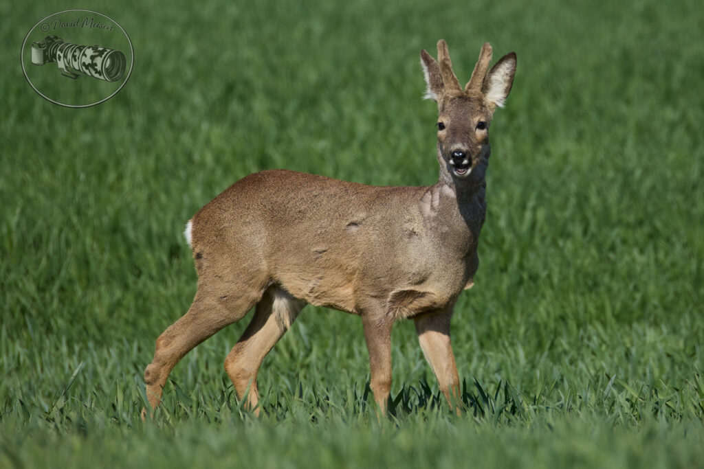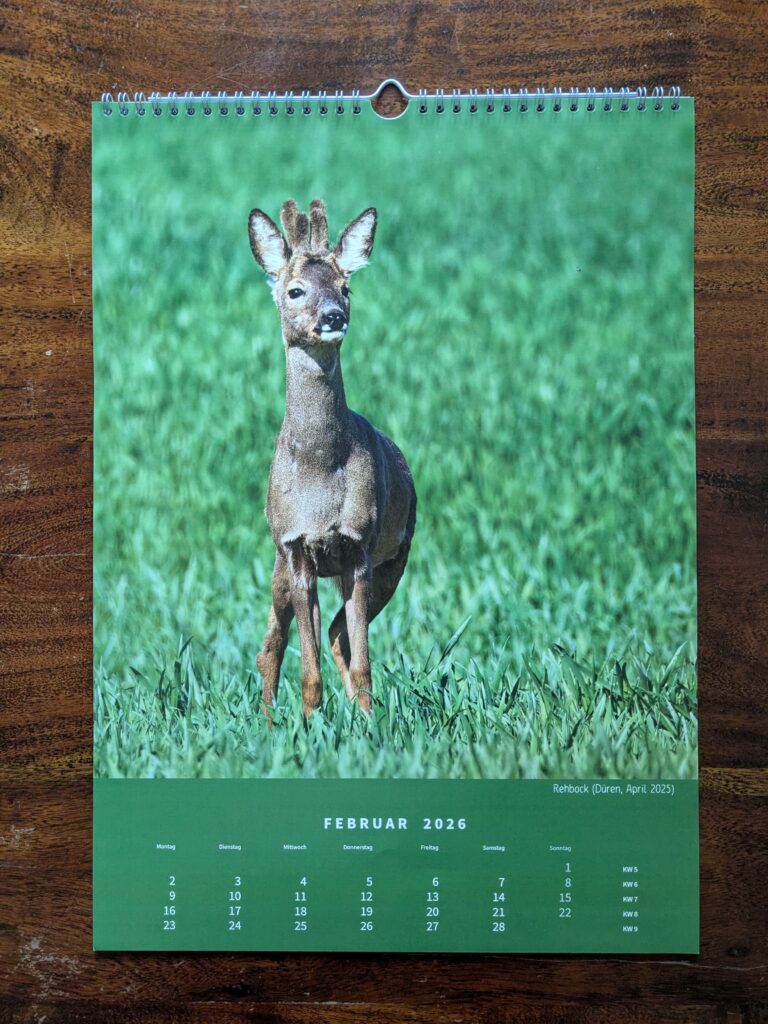 So schnell ist der erste Monat des Jahres auch schon verstrichen und wir sind im Februar gelandet. Dein Kalender zeigt Dir in den nächsten 28 Tagen einen Rehbock, wie er am 02. April des letzten Jahres in einem jungen Weizenfeld steht. Hübsch steht es da, dieses schöne Tier. Rehe sind gute Botschafter für die hiesige Wildnis, denn mindestens außerhalb der Innenstädte, dürfte jeder Mensch wohl schon einmal eins in freier Natur gesehen haben. Das Einsperren in Wildparks funktioniert mit ihnen, anders als mit Hirschen, nämlich nicht. Ein Reh zu sehen bedeutet also immer auch in seinen Lebensraum eingetaucht zu sein, ohne es im Normalfall bemerkt oder gar vorgehabt zu haben. Laut der deutschen Wildtierstiftung leben hierzulande etwa 2,5 Millionen Rehe, also ein mehr als stabiler Bestand. Unsere Begegnungsstätten können vielseitig sein. Im Wald, auf der Wiese und in den Agrarlandschaften haben wir ebenso die Chance, wie in geeigneten Siedlungsbereichen oder sogar isoliert auf Friedhöfen (z.B. in Wien). Rehe sind anpassungsfähig und fühlen sich überall dort wohl, wo man sie und ihre Verstecke in Ruhe lässt und wo sie etwas zu Fressen finden. Das kann dann eben auch schon einmal der eigene Garten sein. Wer soviel Glück hat, hat vielleicht auch schon verwundert festgestellt, wie klein so ein Reh überhaupt ist. Da wir sie normalerweise nur aus der Ferne beobachten, stellen wir sie uns gerne viel größer vor, als sie sind. Gerade einmal 70cm misst das Tier vom Fuß bis zum Rücken. Viel größer als ein Schäferhund sind sie also nicht.