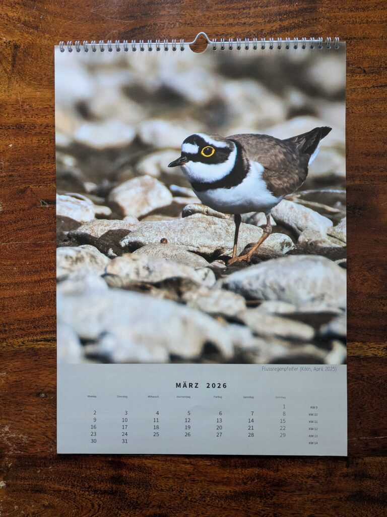 Das Kalenderblatt zeigt einen ganz besonderen Naturschatz mit einem skurrilen wie niedlichen Namen. Der Flussregenpfeifer kommt bei uns nur vom Frühling bis zum Herbst vor und ist also einer dieser Vögel, die jetzt wieder bei uns eintreffen. Dieses Bild ist Anfang April des letzten Jahres entstanden, als er sich lange am Rheinufer des nördlichen Stadtrands von Köln aufhielt. Sein Lebensraum lässt sich gut mit „Kies am Wasser“ beschreiben, denn dort errichtet er seine Nester am Boden. Und das ist mitunter sein Problem. Sein Vorkommen in Deutschland nimmt rapide ab. Gründe dafür sind (wie immer) verbaute Lebensräume, Fressfeinde, Bruträuber und der Wechsel von Austrocknung und Hochwasser. An diesem Beispiel erklärt es sich leicht. Zu der Zeit, in der diese Aufnahme entstanden ist, hatte es lange nicht oder nur wenig geregnet. Der Rhein stand daher ziemlich tief und es bildeten sich kleine Kies-Inseln. Dort hielten sich die Flussregenpfeifer auf. Geschützt durch das Wasser, welches sie vom tatsächlichen Ufer trennte. Gut möglich, dass sie genau dort auch brüten wollten oder gar ihre Nester angelegt hatten. Allerdings stieg der Pegel des Rheins naturgemäß nach einigen starken Regenfällen wieder und die Inseln verschwanden. Eine erfolgreiche Brut ist so natürlich nicht möglich. Hoffen wir, dass sie irgendwo am Ufer mehr Glück hatten.