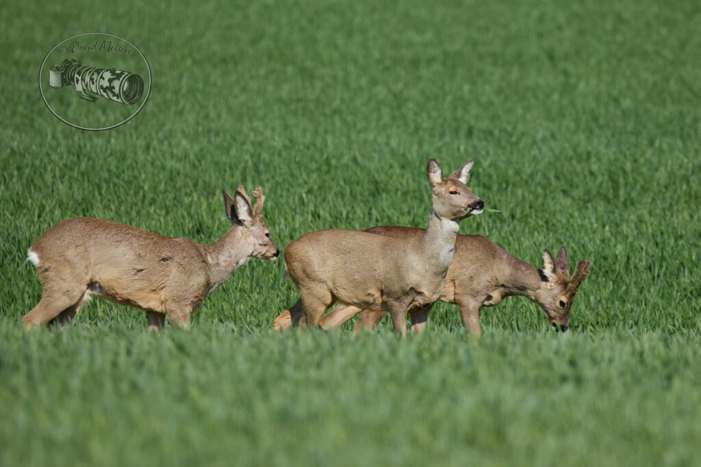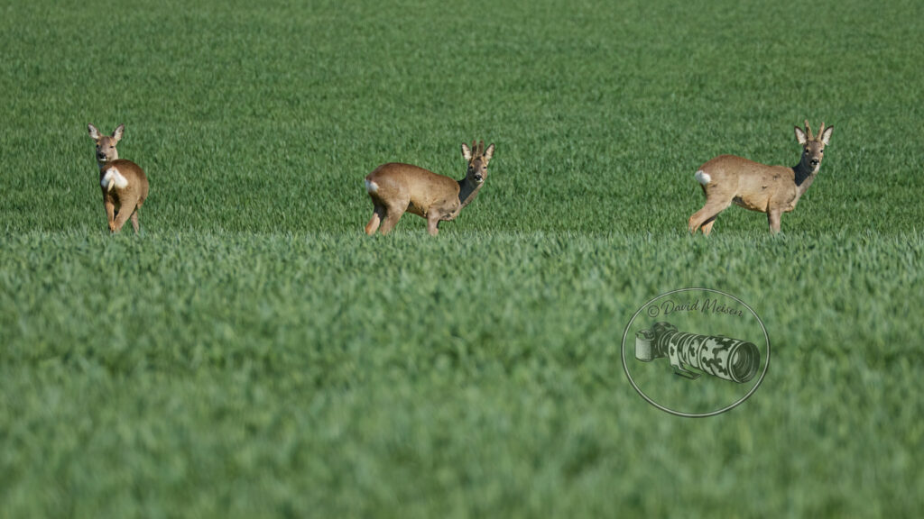 Eigentlich ist das Fotografieren von Rehen gar nicht so leicht, wie es hier im Ergebnis scheint. Wenn man als Busch verkleidet stundelang an einer vielversprechenden Waldlichtung wartet, mag es vorkommen, dass ein Reh aus der Deckung tritt und mit viel Glück dann irgendwann nur wenige Meter vor der Kamera steht. In dieser Situation aber wurde ein anderer Trick angewandt, nämlich der „ahnungslose Spaziergänger“. Rehe sind durchaus schreckhafte Fluchttiere, die eigentlich keine Nähe tolerieren und schnell das Weite suchen. Sie sind sehr aufmerksam. Bevor sie flüchten, halten sie allerdings meist inne, erstarren und gucken dich an. Das ist die Chance, so zu tun, als hätte man sie selber gar nicht gesehen und weiterzugehen. Und nach eben diesem Prinzip bin ich zügig und ohne weiteren Blick den Feldweg weitergelaufen, bis ich einen Heckenstreifen erreicht hatte, hinter dem ich mich verstecken konnte. Das hat als Tarnung offenbar ausgereicht und die Rehe haben in aller Ruhe weitergeäst. Dabei sind sie dem Heckenstreifen relativ nahe gekommen.
