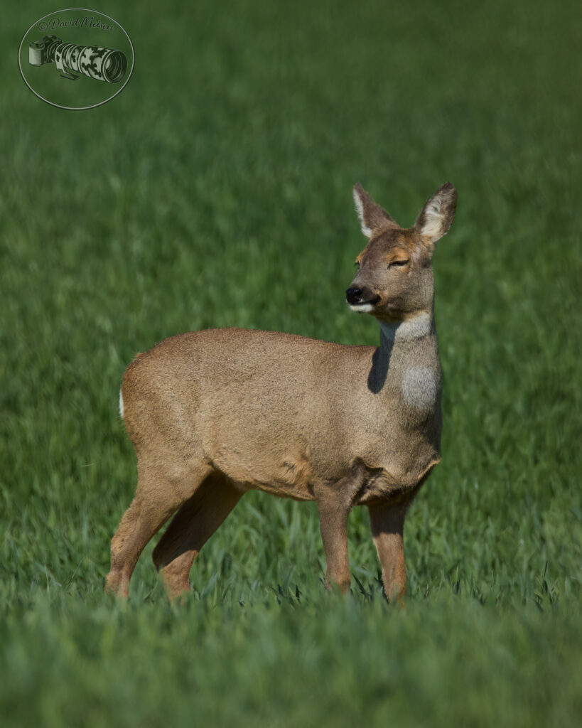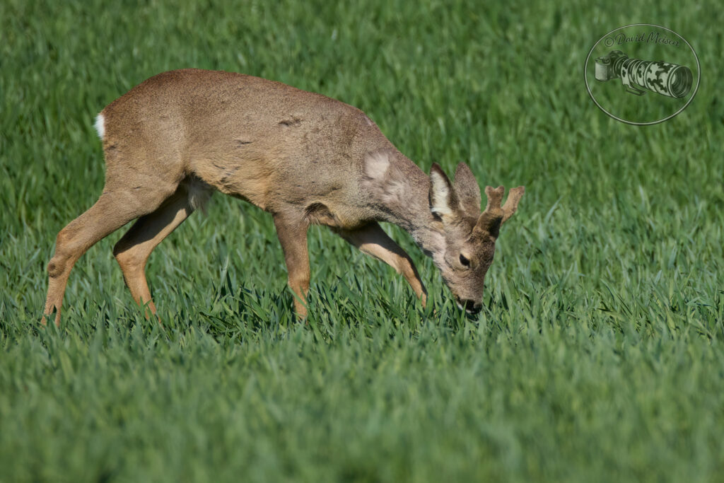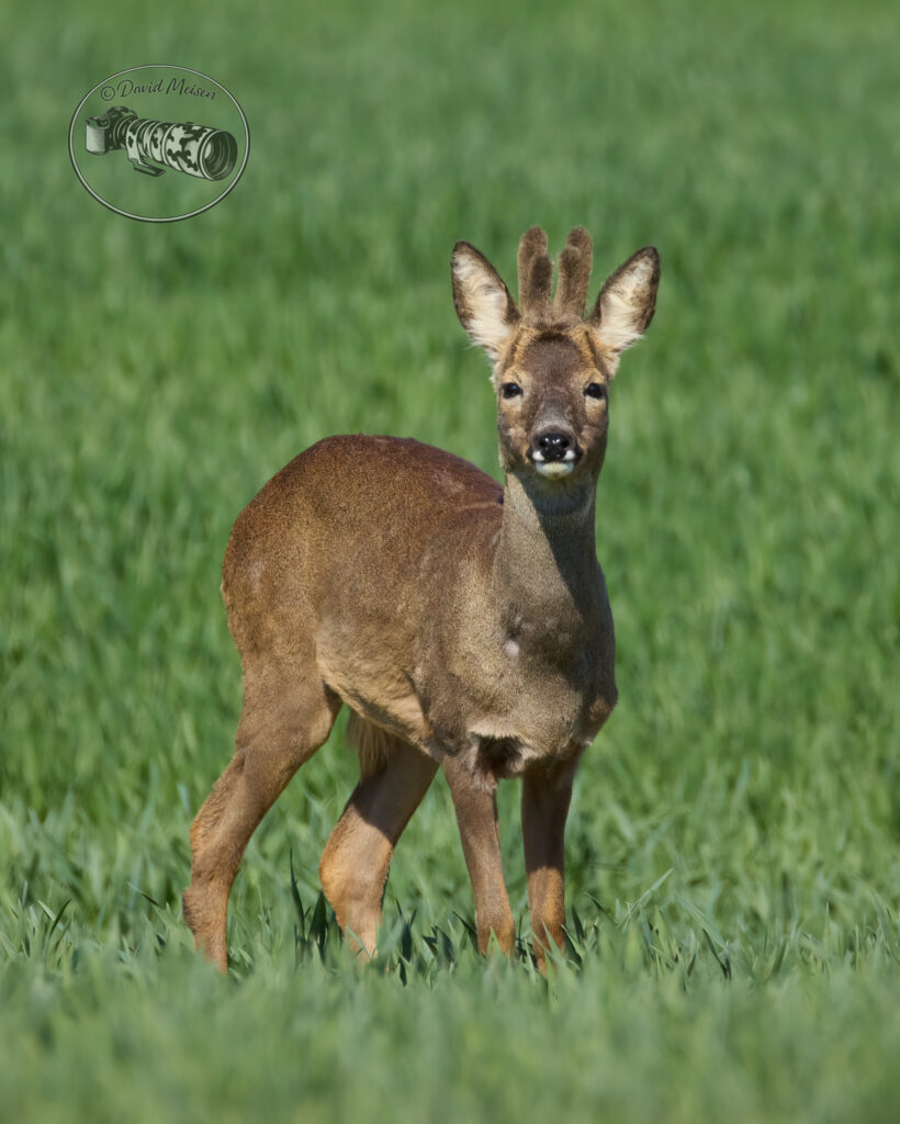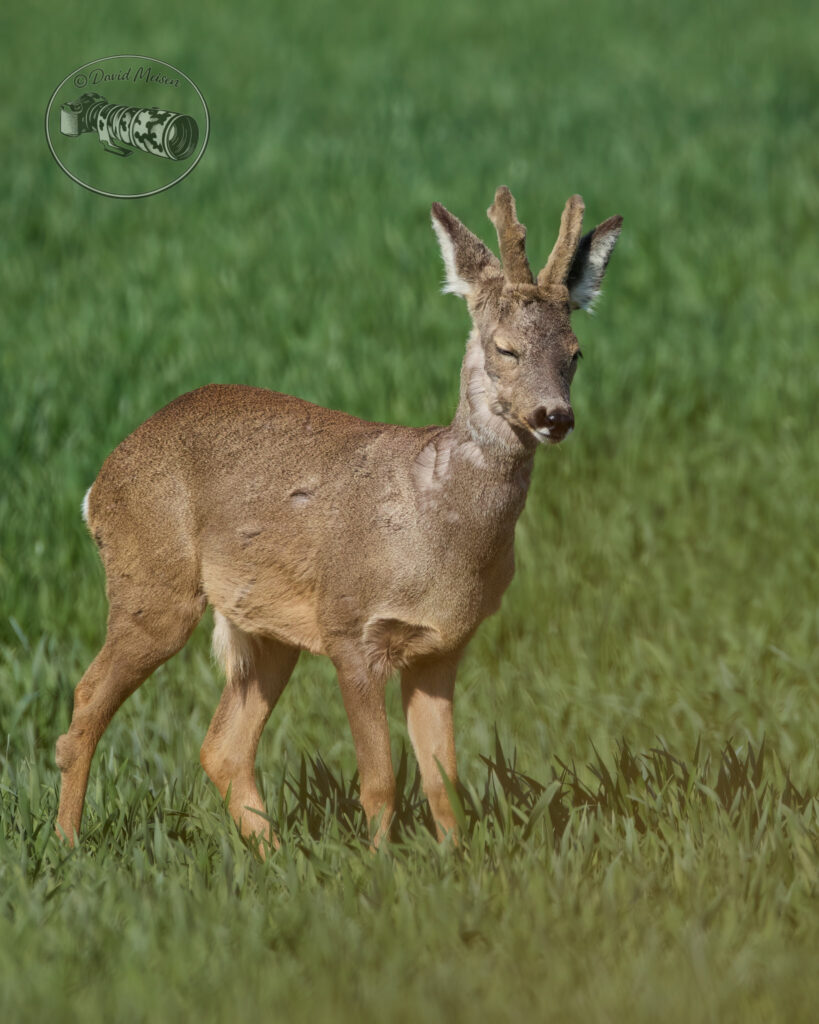 Hunde sind eine gute Überleitung zur Entstehung dieses Fotos. Aufgenommen wurde es kurz vor der Autobahnauffahrt in Richtung Köln, an einem Feld nahe Düren. Grundsätzlich gibt es auf dem sehr landwirtschaftlich geprägten Streckenabschnitt zwischen A4 und meinem Arbeitsort wirklich viel zu sehen. Fasan, Rebhuhn, Mäusebussard, Turmfalke, Graureiher, Feldhase, Fuchs oder eben Reh zeigen sich dort je nach Jahreszeit häufig. Leider reicht es meist aber nur für den flüchtigen Blick aus dem fahrenden Auto, denn Anhaltemöglichkeiten sind rar. Kurz vor der Autobahn aber geht einer der wenigen Feldwege von der Bundesstraße ab und dort habe ich im Frühjahr einige Male kurz angehalten. Grund dafür war eigentlich ein Turmfalkenpärchen, welches dort gerne jagte und sich dabei oft auf den Leitungsmasten am Feldrand ausruhte. So auch an diesem Tag. In weiterer Ferne standen dann aber eben die 3 Hunde im Feld. Die Verärgerung über die freilaufenden Bernhardiner entpuppte sich schnell als unbegründet, denn die Hunde waren gar keine. Es waren 3 Rehe, die am Mittag bei schönstem Wetter mitten im Feld standen. Durch das Objektiv zeigte sich, dass hier eine Ricke mit zwei vermutlich jungen Böcken unterwegs war. Das Geweih des abgebildeten Bocks ist noch vom sogenannten „Bast“ überzogen. Was aussieht, wie ein plüschiger Überzug, ist eigentlich dafür gedacht, das neue Geweih im Wachstum zu schützen und mit Nährstoffen zu versorgen. Rehböcke werfen ihr Geweih zum Ende eines jeden Jahres ab und im Frühjahr, wenn das neue unter der Basthaut vollständig ausgebildet wurde, wird die samtige Schutzhülle einfach an Bäumen und Büschen abgestreift. Das dürfte bei diesem Reh nicht lange nach der Aufnahmesituation geschehen sein. Ebenso wie ein Fellwechsel, der sich hier auch schon deutlich andeutet.